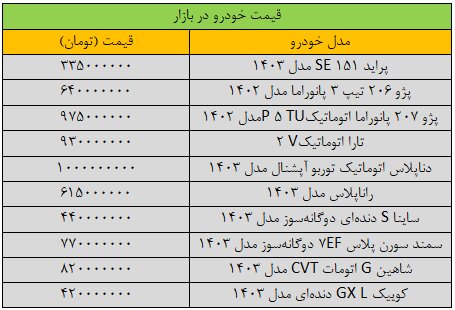ترمز قیمت خودرو کشیده شد/ آخرین قیمت پژو، ساینا، تارا، کوییک و شاهین + جدول